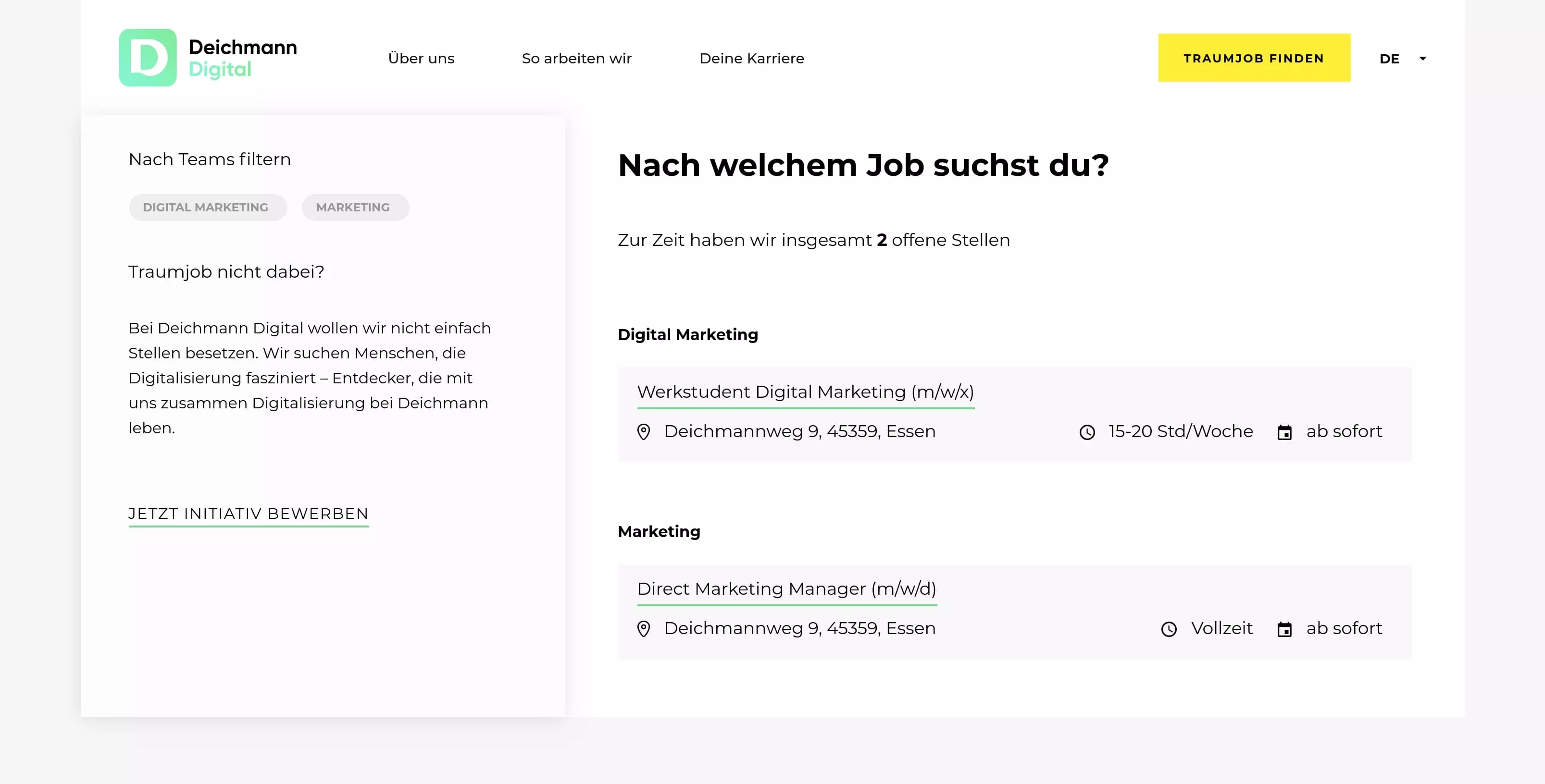 The main goal of this project was for Deichmann to be able to attract top digital talent. Since the launch of the website, a lot of applicants are now flocking to apply for digital positions in Essen and appreciate Deichmann's innovation push!